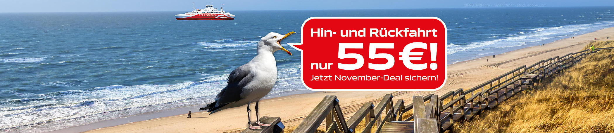 I november kan du rejse til Sylt til en venlig pris. For kun 55 € kan du sikre dig en returrejse med din bil på FRS Sylt-færgen. Prisen for en enkeltbillet er 35 €.